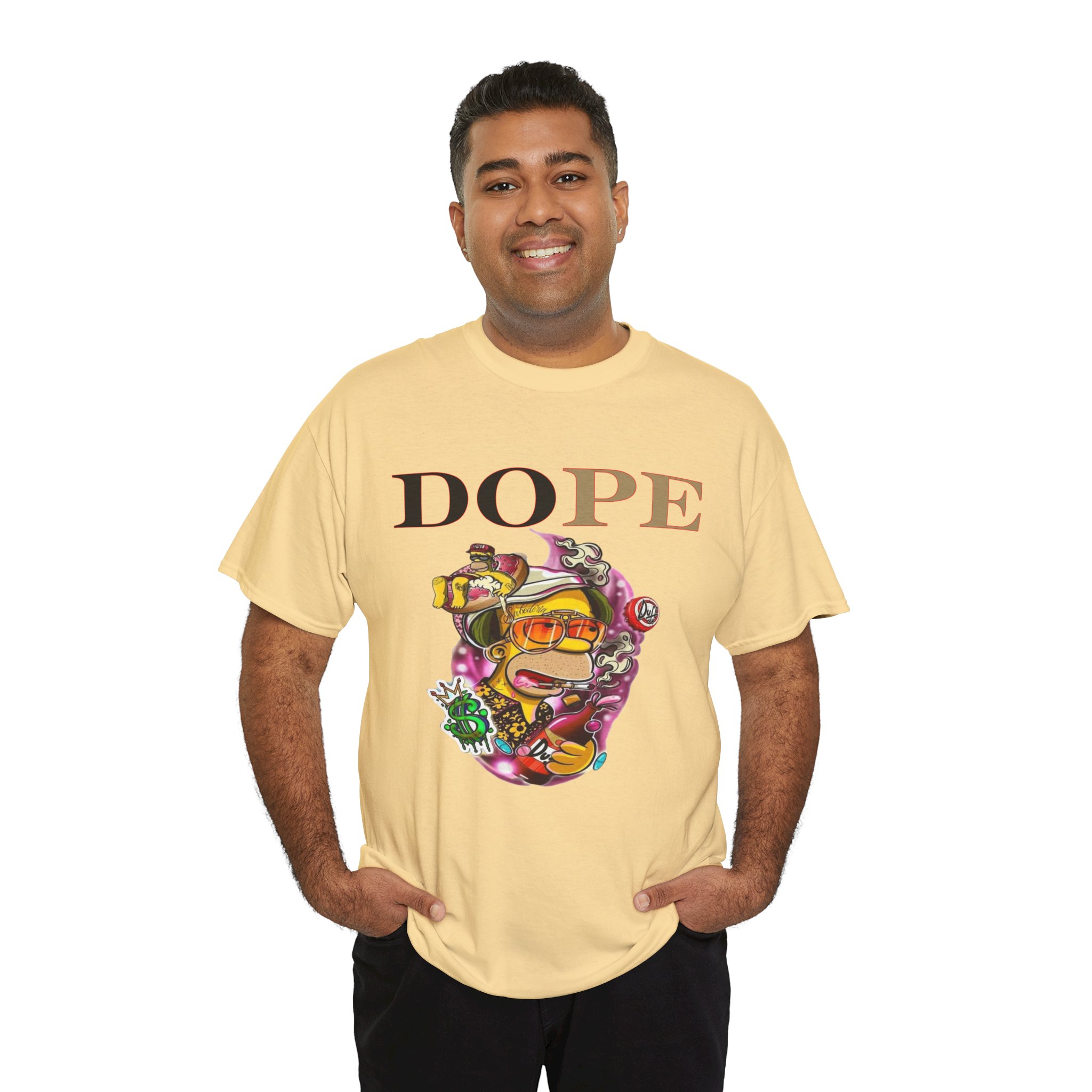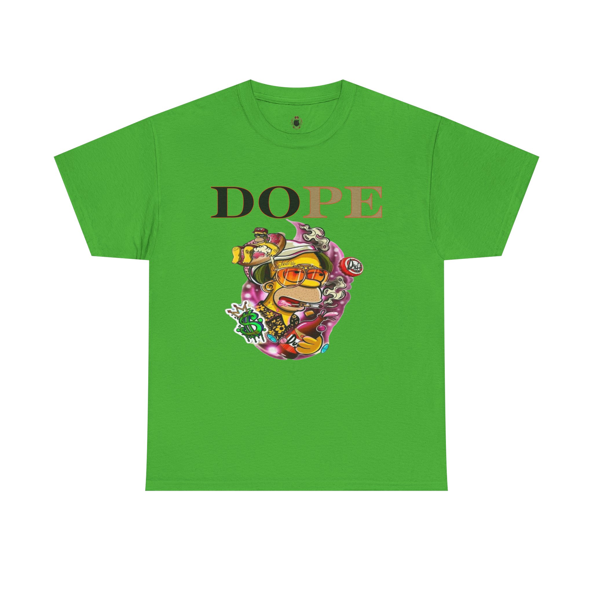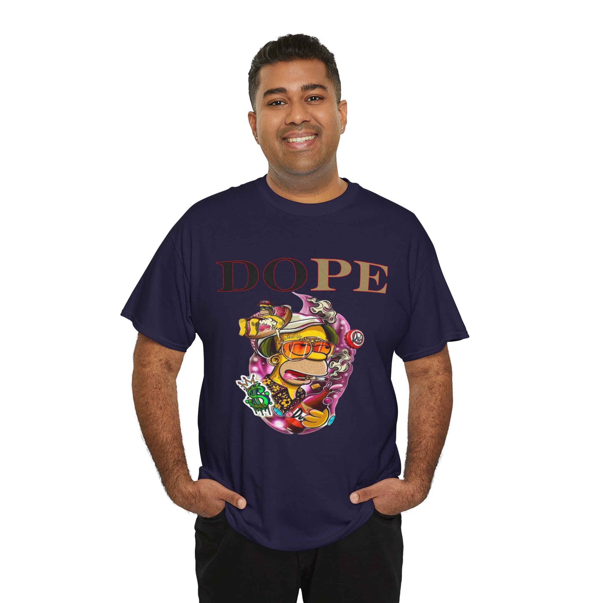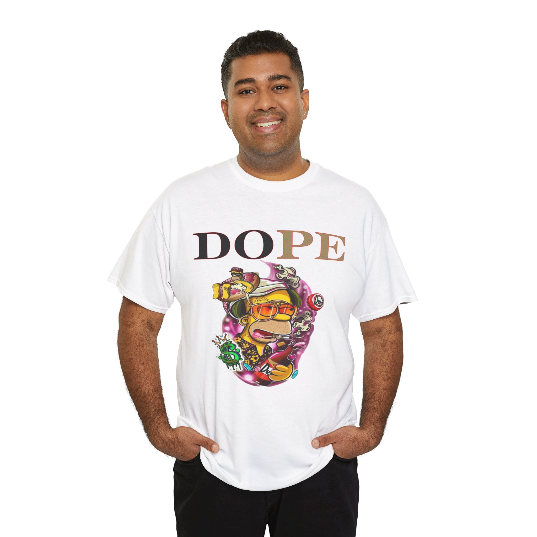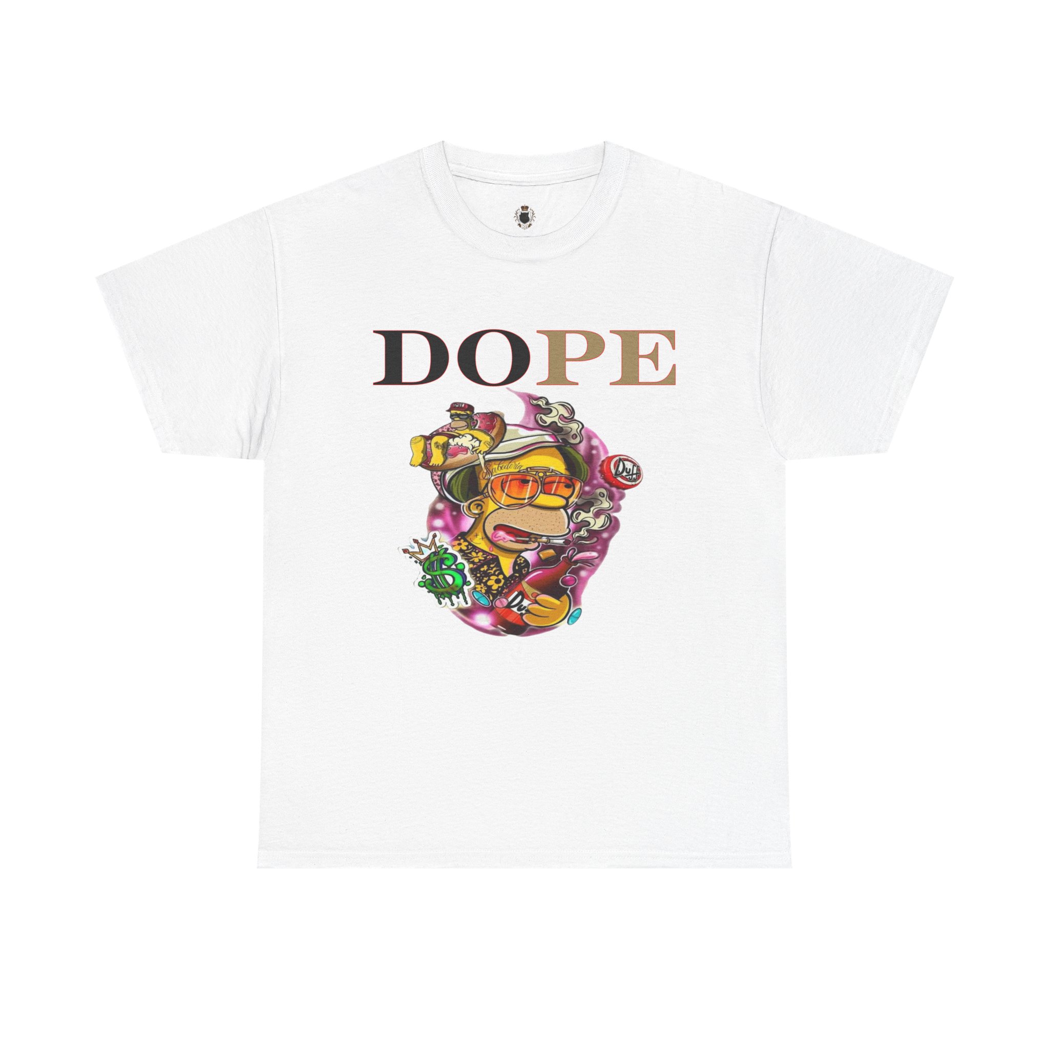 A DoPE Homer Simpson inspired T-shirt that exudes a fun and playful vibe. Perfect for fans of the iconic cartoon character and those who appreciate unique and offbeat designs. Ideal for casual wear, lounging, or as a statement piece for a themed party.
