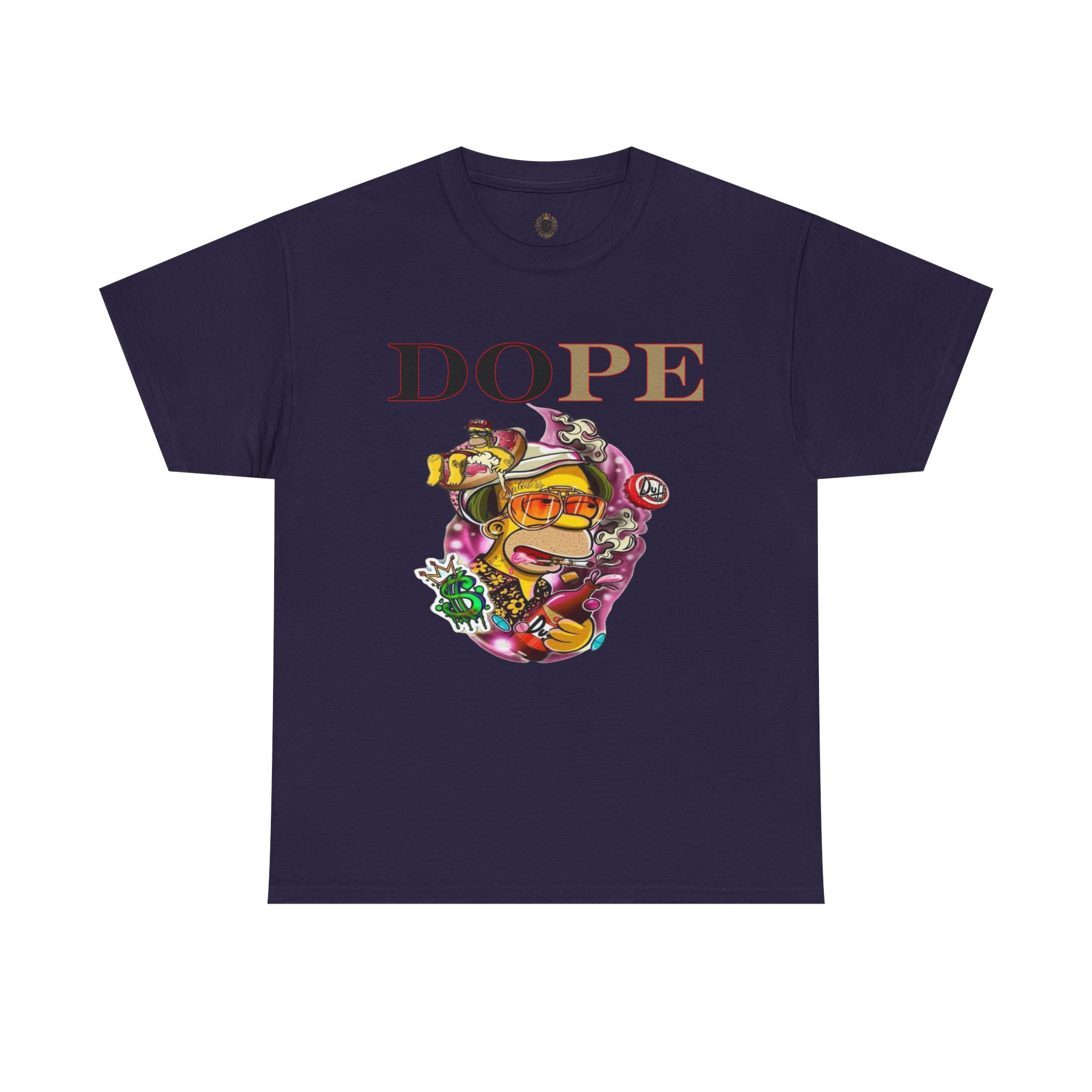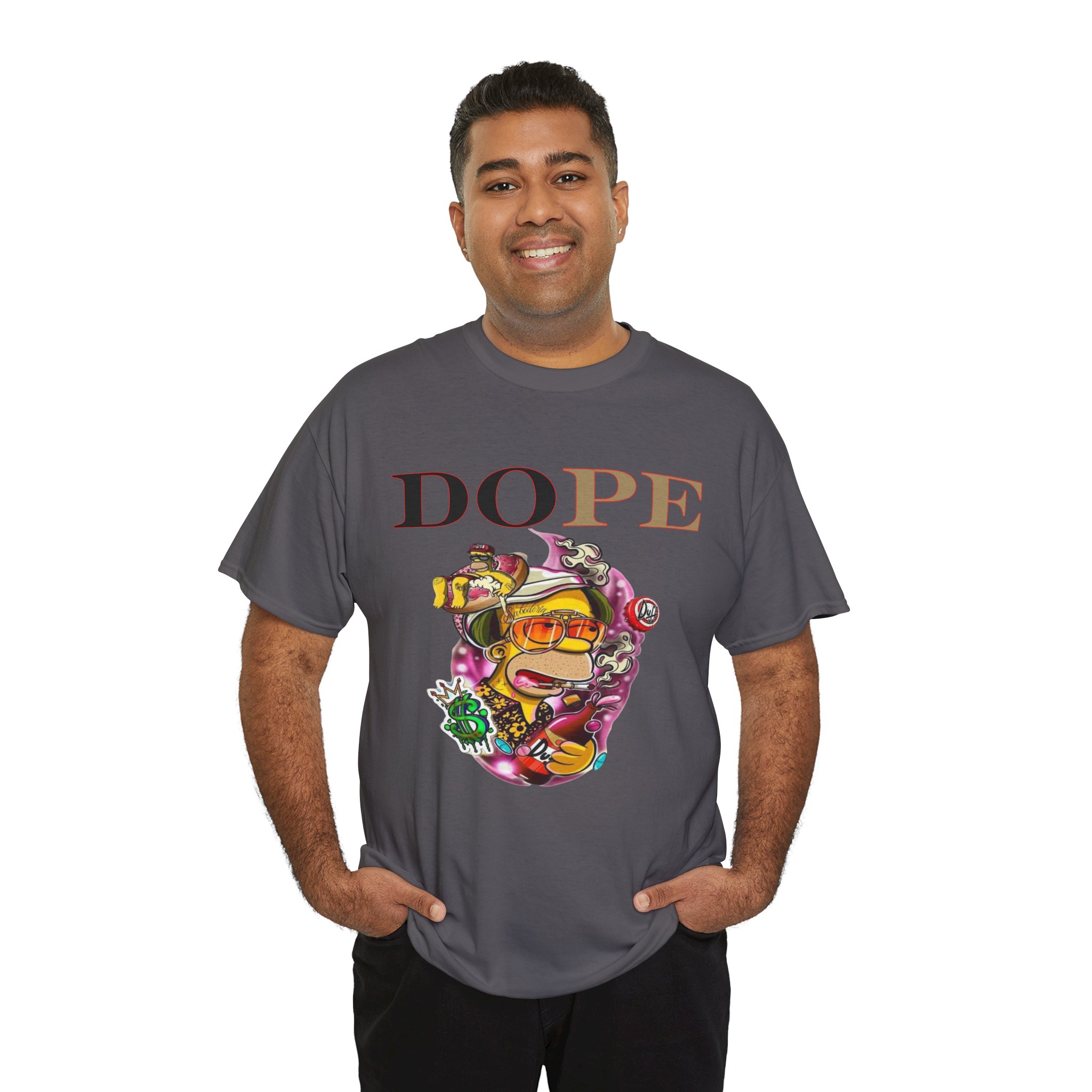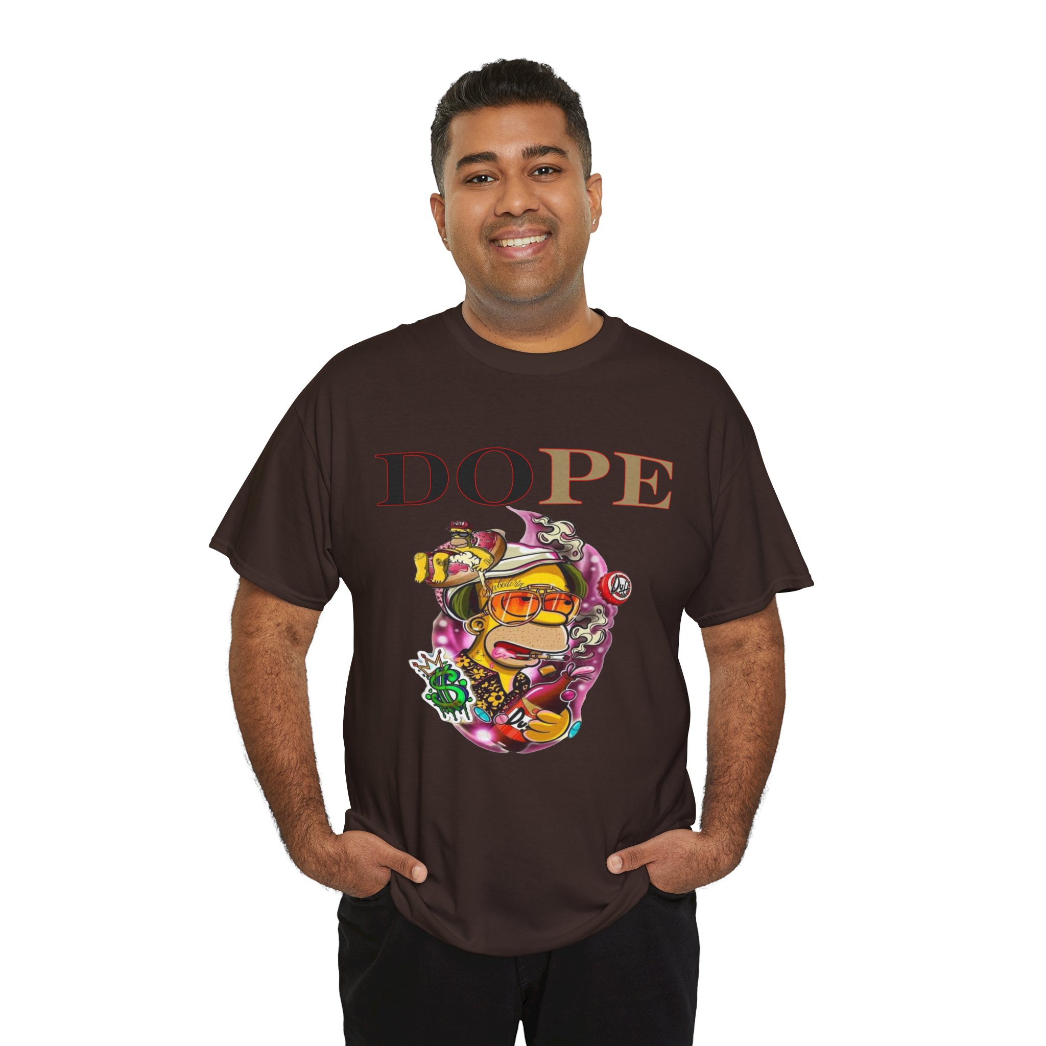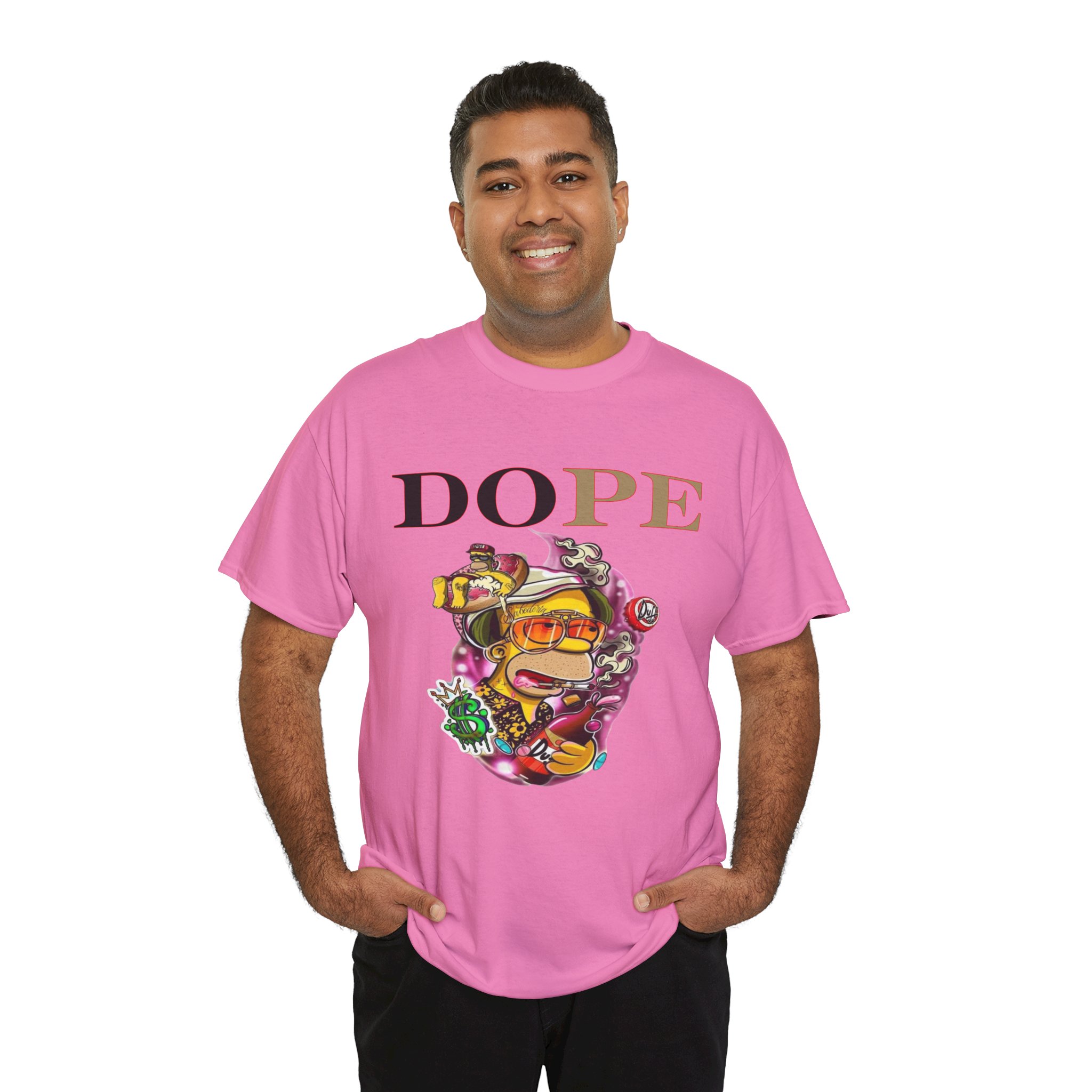 A DoPE Homer Simpson inspired T-shirt that exudes a fun and playful vibe. Perfect for fans of the iconic cartoon character and those who appreciate unique and offbeat designs. Ideal for casual wear, lounging, or as a statement piece for a themed party.